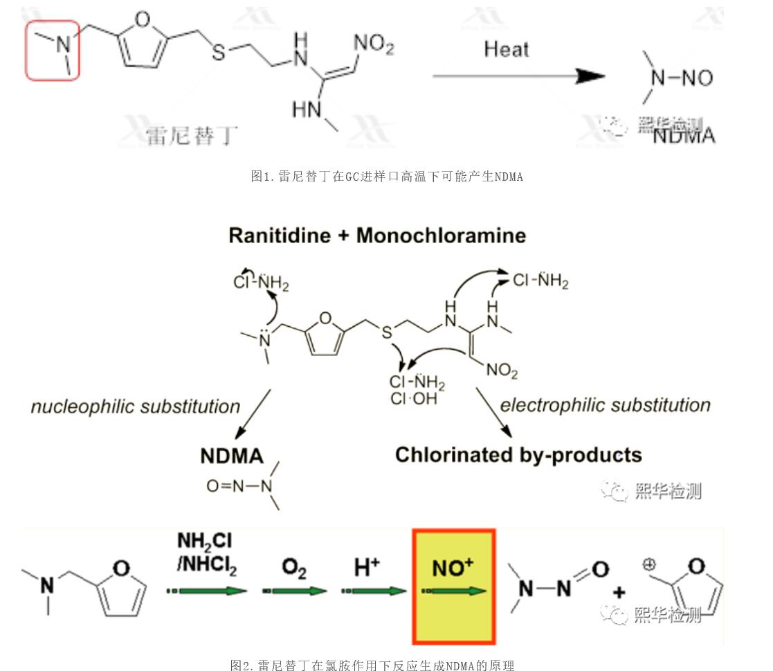 值得注意的是,有報道稱雷尼替丁在使用HS-GC-MS/MS方法檢測的時候,會出現(xiàn)假陽性結果。有研究表明,該結果是因為部分雷尼替丁樣品在GC進樣口的高溫環(huán)境下降解產生NDMA導致(圖1)。也許是冥冥之中早有定數(shù),雷尼替丁作為一個普通的組胺H2受體阻斷劑,早在2012年【1】和2014年【2】就被當作模型化合物用于研究三級胺的亞硝酸化反應(圖2)。上述文獻顯示,雷尼替丁在氧化劑的作用下(NH2Cl,注意不是氯化銨,該化合物是一種消毒劑)作用下,能夠通過一系列復雜的分子內反應生成NDMA。