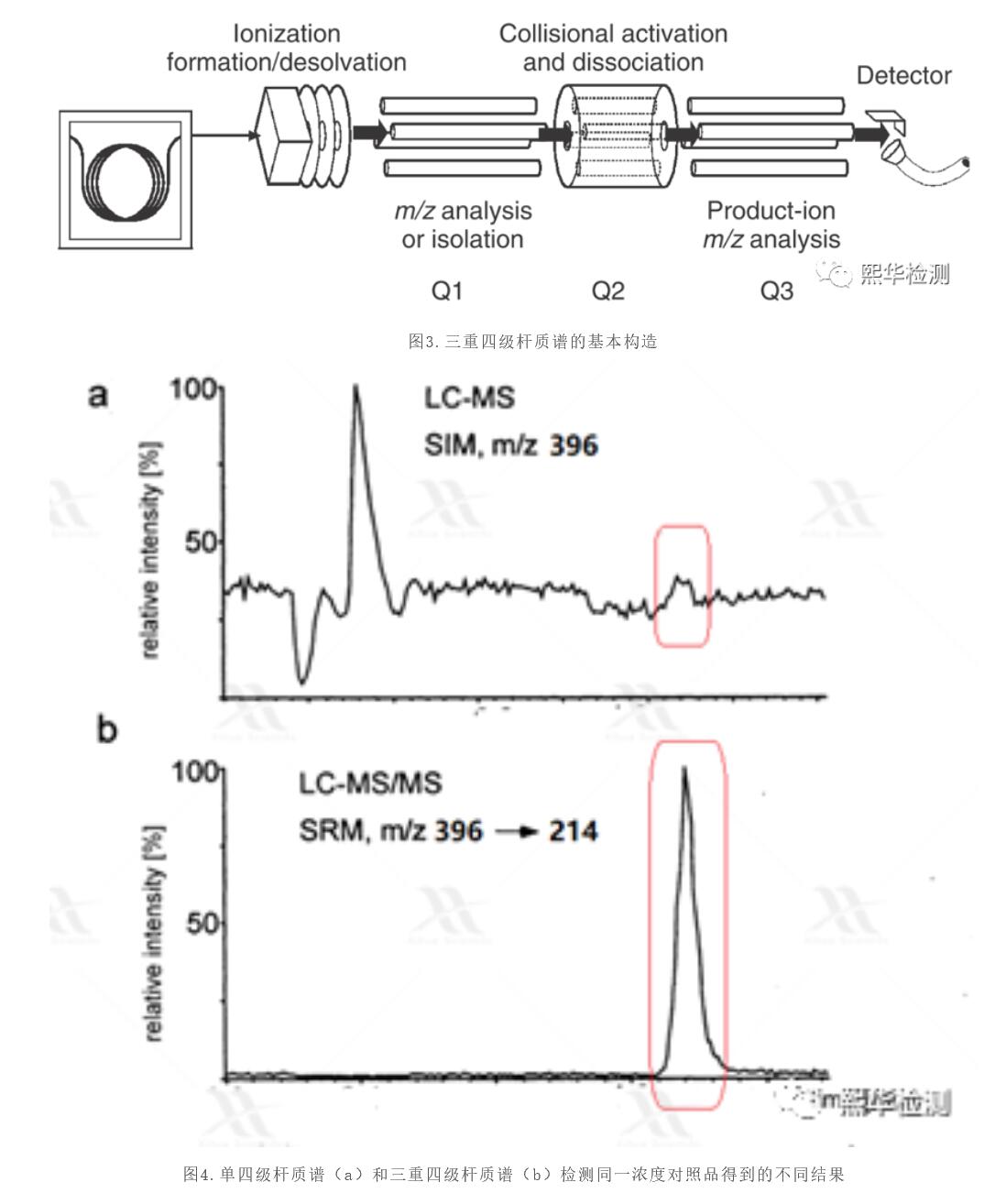 說到定量,毫無疑問,還是應該請我們分析定量界的王者-三重四極桿質譜上場。雖然屬于低分辯質譜,但由于其獨特的結構設計(圖3),通過Q1篩選母離子,Q3篩選碎片離子來濾過干擾,大大降低了噪音信號,提高了分析靈敏度(圖4)。