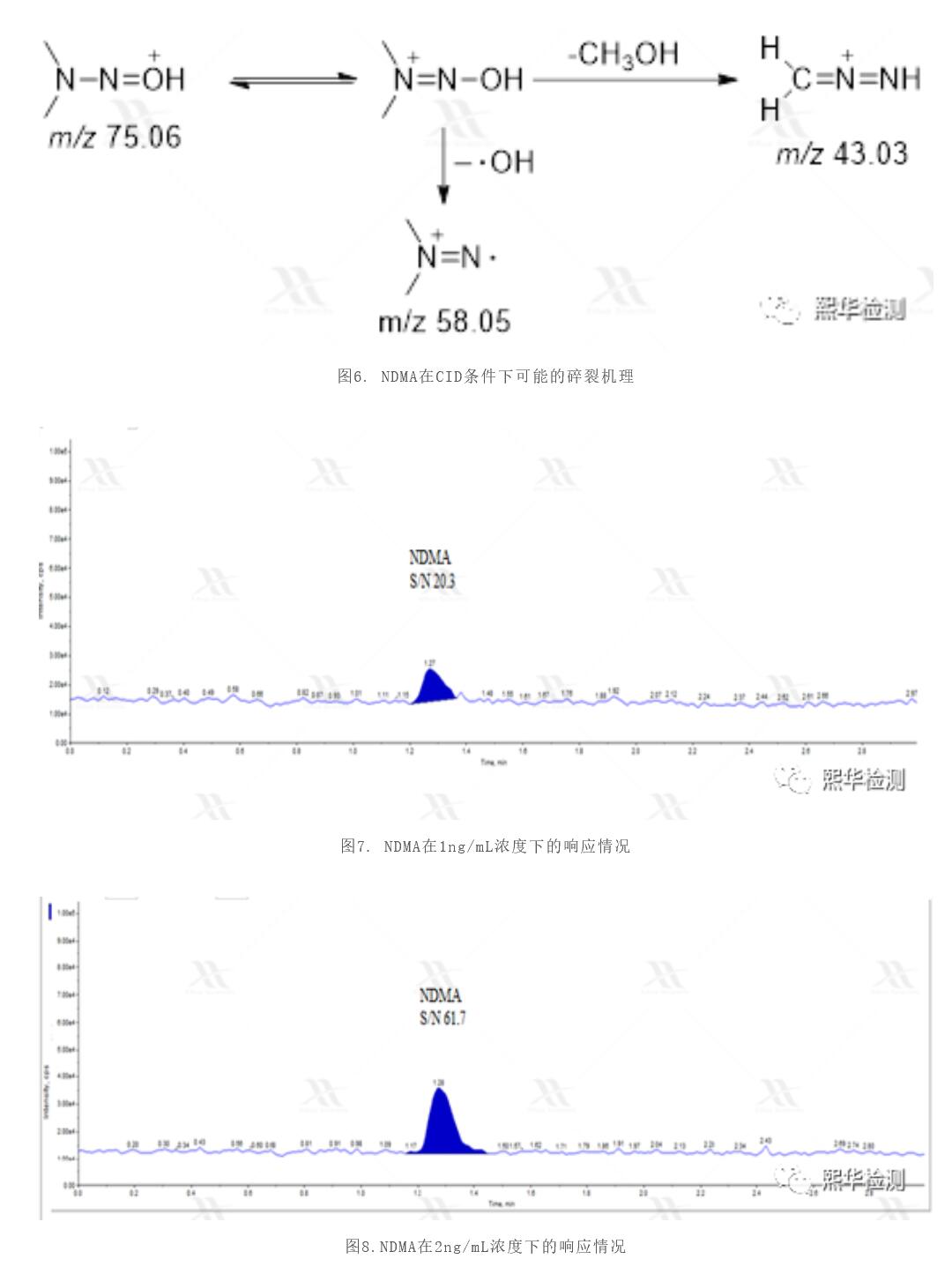 為了考察三重四極桿質譜對NDMA的檢測能力,我們從幾臺API 6500plus液質系統(tǒng)(市面上靈敏度和穩(wěn)定性最突出的三重四級桿質譜)中隨機選擇了一臺并開展了試驗(圖5)。通過條件摸索,可知NDMA質子加合物在常規(guī)CID(碰撞誘導解離)條件下,主要碎裂為m/z 43和m/z 58兩種碎片離子,推測其可能通過丟失甲醇分子以及羥基自由基【3】得到上述碎片(圖6)。鑒于該原理,我們使用m/z 43為定量離子,m/z 58作為定性離子。如圖7所示,使用FDA官方公布的液相條件,1ng/mL下NDMA對照品的信噪比為20.3,2ng/mL時為61.7,六針峰面積的RSD為2.5%。在有雷尼替丁及其制劑加標的情況下,回收率在90%以上,結果令人滿意。但另一方面,我們發(fā)現(xiàn)該方法的基線噪音異常地高。這也比較容易理解,因為NDMA質子化后,質荷比只有75,非常容易受到空氣、溶劑以及緩沖鹽體系中小分子雜質的干擾,導致噪音較大。