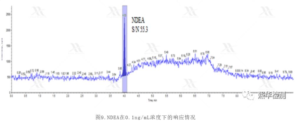 如上所述,三重四極桿質譜對NDMA的檢測能力令人滿意,我們相信類似的方法對于NDEA的檢測效果會更佳。因為NDEA的分子量為102,受低分子量區(qū)雜質的干擾更小,理論上應該有更好的靈敏度。如圖9所示,在0.1ng/mL濃度下,NDEA的信噪比達到55,證實了上述推測。