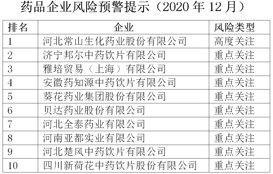 近日,中國健康傳媒集團(tuán)輿情監(jiān)測中心發(fā)布藥品企業(yè)風(fēng)險預(yù)警提示(2020年12月),公開風(fēng)險指數(shù)排名前十的企業(yè)。河北常山生化藥業(yè)股份有限公司(以下簡稱常山藥業(yè))排名第一,為“高度關(guān)注企業(yè)”;濟(jì)寧邦爾中藥飲片有限公司、雅培貿(mào)易(上海)有限公司、安徽藥知源中藥飲片有限公司、葵花藥業(yè)集團(tuán)股份有限公司、貝達(dá)藥業(yè)股份有限公司、河北全泰藥業(yè)有限公司、河南亞都實業(yè)有限公司、河北楚風(fēng)中藥飲片有限公司、四川新荷花中藥飲片股份有限公司分列第2至10位,為“重點關(guān)注企業(yè)”。