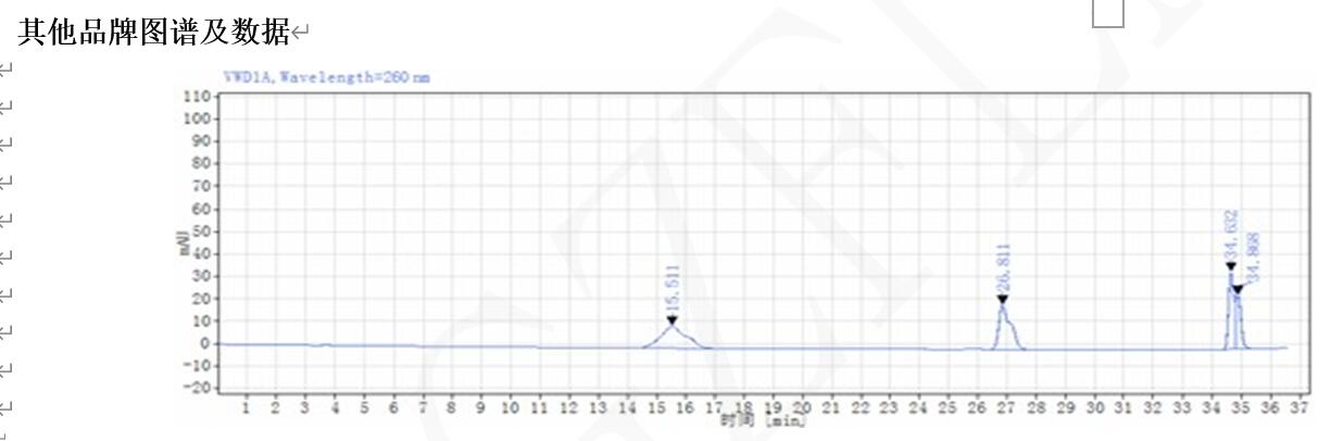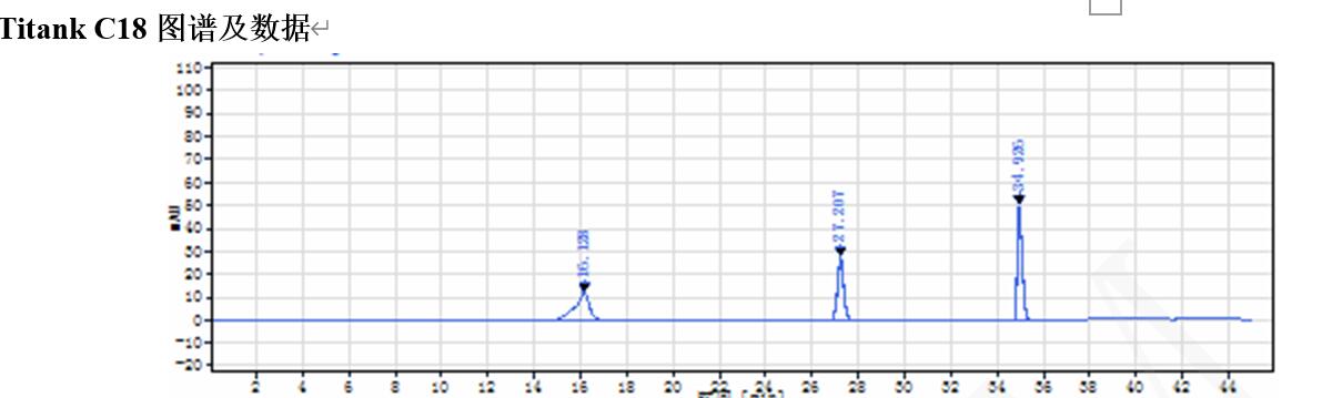 而本方法中更是使用了 100%水相 ,使用 TitankC18 與其他品牌色譜柱對比,發(fā)現 TitankC18 色譜柱峰型及壽命 優(yōu) 于 其 他 品 牌 色 譜 柱 。 該 流 動 相 體 系 適 合 轉 換 成 LC-MS 檢 測 。