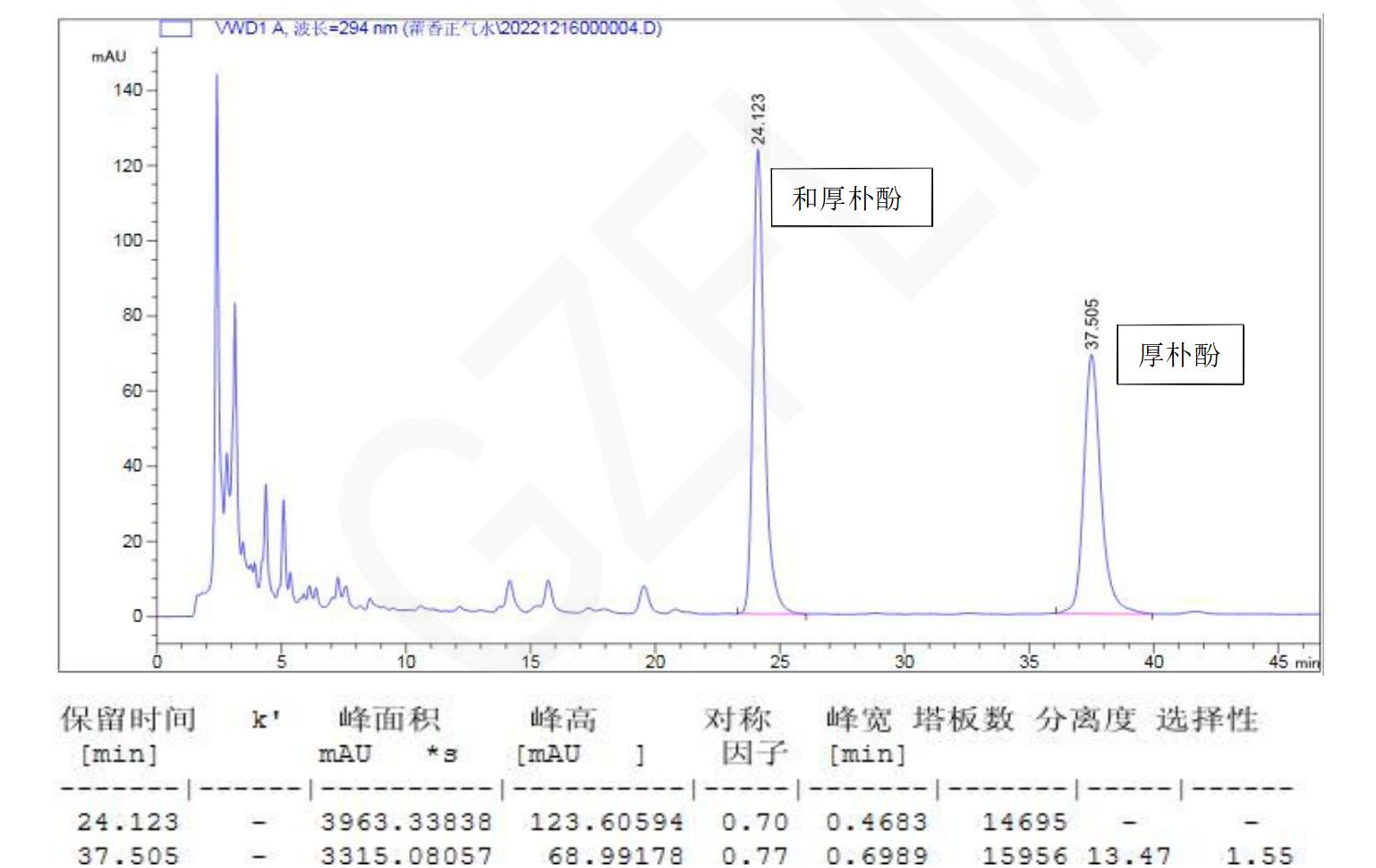 【厚樸測(cè)定】 理論塔板數(shù)按厚樸酚峰計(jì)算應(yīng)不低于 5000