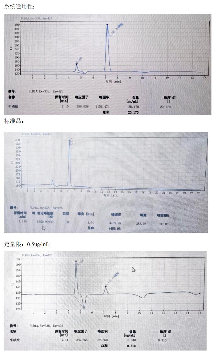 App ID: FLM-M240001 GB 5009.169-2016 食品中牛磺酸的測定 色譜柱:MARS MNa 5u,250*4.6mm(貨號:FMG-1036-EONU) 流動相:檸檬酸三鈉溶液(稱取19.6g 檸檬酸三鈉,加950mL 水溶解,加入1mL 苯酚,用硝酸調pH 至3.10-3.25, 經 0.45um 微孔濾膜過濾。 流速:0.4mL/min 熒光衍生溶劑流速:0.3mL/min 檢測波長:激發(fā)波長:338nm, 發(fā)射波長:425nm 柱溫:55℃ 柱后衍生系統(tǒng):SSI Allchrom PCR6000 柱后衍生系統(tǒng) 檢測器:熒光檢測器進樣量:20ul 樣品: