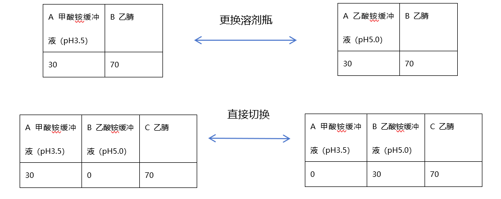 Part 2 三元泵相比二元泵的優(yōu)勢(shì) 1. 便于對(duì)比不同種類或pH的流動(dòng)相 在開發(fā)一個(gè)新的分析方法時(shí),通常需要篩選不同的溶劑組合以找到最佳分離效果。例如,可能需要嘗試: 不同pH的緩沖液:比如甲酸銨緩沖液(pH3.5)和乙酸銨緩沖液(pH 5.0)。 不同的有機(jī)相:比如甲醇和乙腈,它們的洗脫強(qiáng)度和選擇性不同。 對(duì)于二元泵,如果你想從“乙腈-甲酸銨緩沖液(pH3.5)”切換到“乙腈-乙酸銨緩沖液(pH 5.0)”,你必須手動(dòng)更換泵B的溶劑瓶,并從泵A的瓶子中倒掉舊的緩沖液,更換新的緩沖液。這需要停機(jī)、沖洗系統(tǒng)、重新平衡,非常耗時(shí)且容易出錯(cuò)(如產(chǎn)生氣泡、殘留污染)。