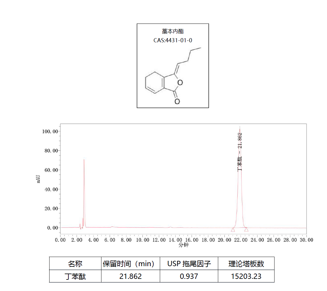 App ID: FLM-T250008 Titank C18-Plus 對川芎中藁本內(nèi)酯含量測定 方法:中國藥典2025 一部 色譜柱:Titank C18-plus 5μ 250×4.6mm (貨號(hào):FMG-0060-EONU) 流動(dòng)相:甲醇:水=52 : 48 流速:1mL/min 檢測:丁苯酞UV 230nm 藁本內(nèi)酯UV 330nm 溫度:35℃ 樣品濃度:8mg/mL(藥典規(guī)定) 進(jìn)樣量:10uL 標(biāo)準(zhǔn)品色譜圖:丁苯酞230nm