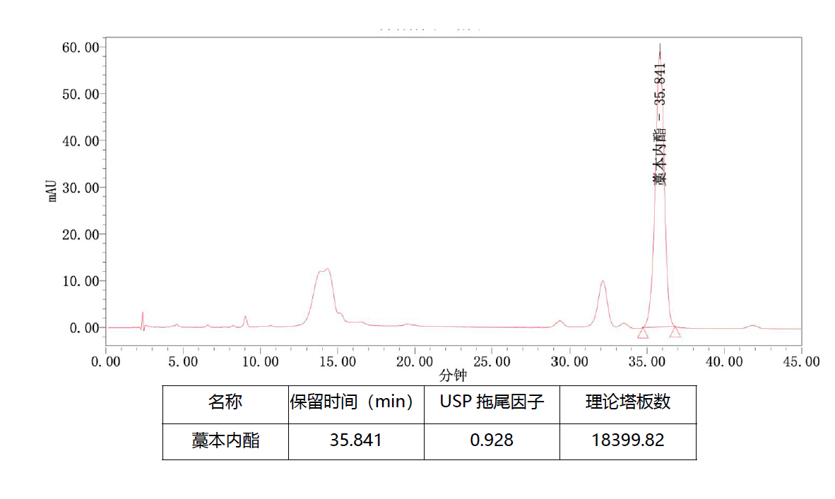 評價(jià):藥典要求丁苯酞峰理論塔板數(shù)高于3000,藁本內(nèi)酯色譜峰與丁苯酞色譜峰相對保留時(shí)間1.67 ± 5% ( 34.69min-38.34min ) , 以上要求非常挑柱。經(jīng)多柱篩選, 采用Titank C18-Plus 5u 250*4.6mm 色譜柱,藁本內(nèi)酯出峰35.84,符合要求,且理論塔板數(shù)遠(yuǎn)高于藥典要求。 |