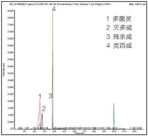 2、添加水平為 0.5 mg/kg 韭菜基質中農殘檢測色譜圖