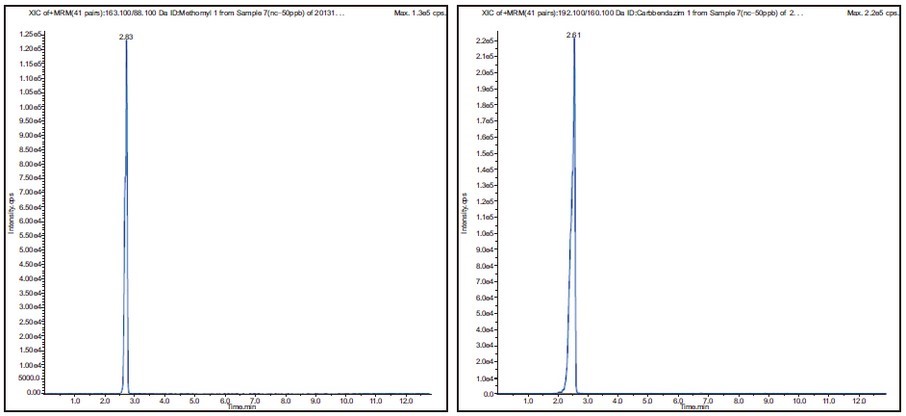 圖 2 滅多威(Methomyl)(163.1/88.1)質譜圖 圖 3 多菌靈(Carbendazim)(192.1/160.1)質譜圖