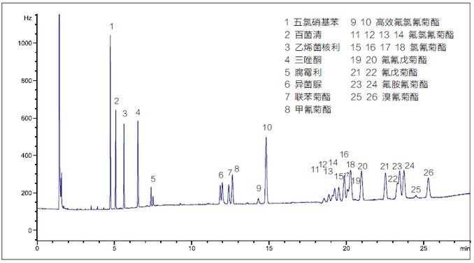 圖1 添加水平為0.2mg/kg大米中有機氯和擬除蟲菊酯類農(nóng)藥多殘留檢測色譜圖