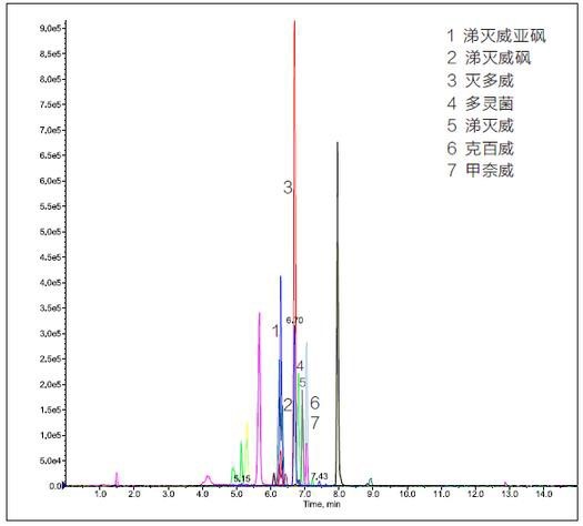 圖2 添加水平為0.05mg/kg大米中氨基甲酸酯類農(nóng)藥多殘留檢測色譜圖