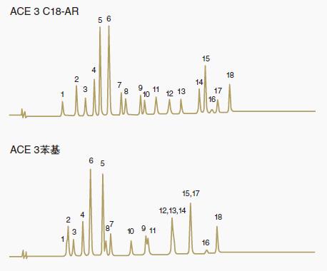 C18-AR可能具有其它不同的分離機(jī)制,可以為復(fù)雜的混合物帶來更好的分離效果。對于其他混合物,可能不是這種情況,這是ACE鍵合相的優(yōu)勢。