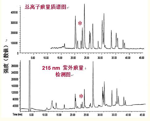 特別是用“*”標(biāo)示的肽對(duì)。它們?cè)?/span>UV檢測(cè)圖譜中顯示的峰值較小,但在質(zhì)譜圖中峰值較大。