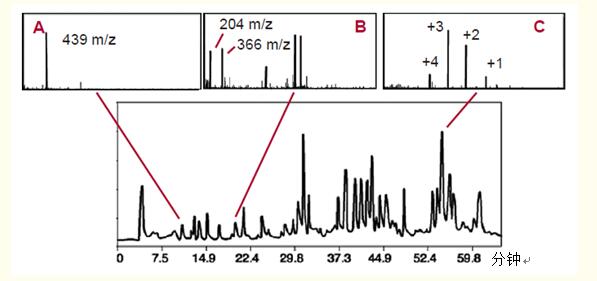 由于質(zhì)譜與反相高效液相色譜正交,因此質(zhì)譜還能確定峰純度或顯示兩種或兩種以上肽的共洗脫,并能提供肽的分子量。
