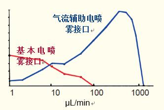 目前,商用電噴霧提供一種高剪切流氮?dú)廨o助的電噴霧(氣流輔助電噴霧),它將電噴霧的最佳流速區(qū)間提升到了200~500μL/min。